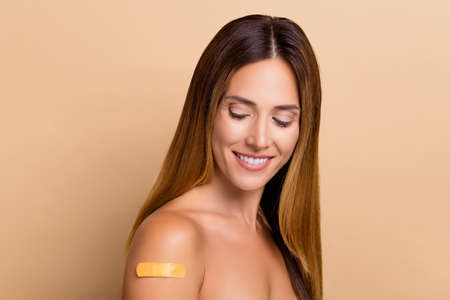 Profile photo of fun mature brown hair lady look plaster naked isolated over beige color background