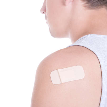 close up of medical adhesive plaster on male shoulder isolated on white background