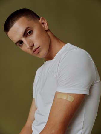 a guy in a white t-shirt with an adhesive plaster on his shoulder injection immunity vaccine passport