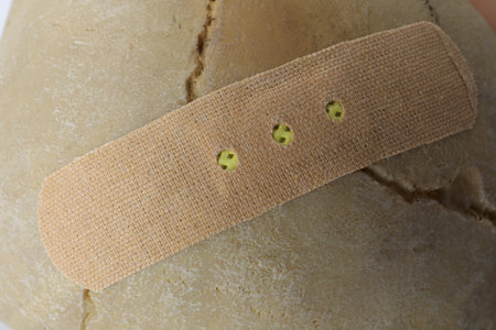 Beige sticking plaster on human skull, closeup