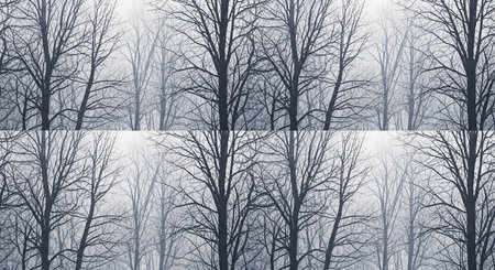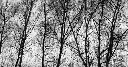 Black and white depressing photo of trees and their branches and gray sky. Foggy and frustrating morning.