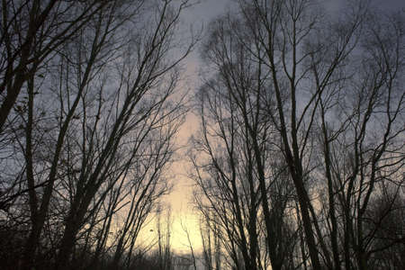 Looking up at tree branches silhouettes, abstract color toned natural background.
