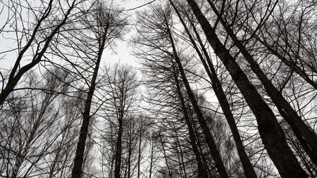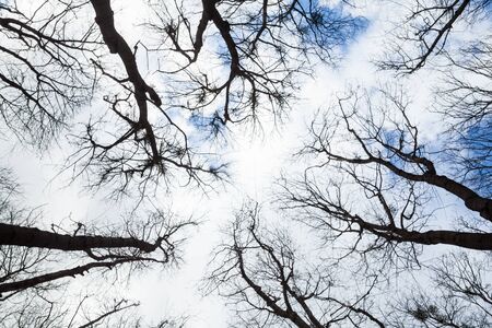 Tree branch. View from below on tree branches in winter. Trees silhouette in sky. Nature forest background.