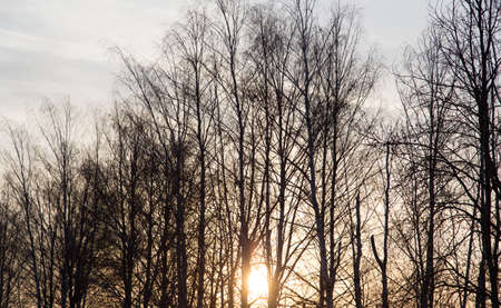 Tree trunks on a background of blue clear sky. Black silhouettes of trunks without leaves. Horizontal.