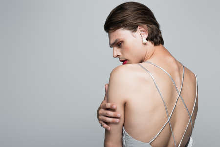 transgender man in slip dress and earring touching hand while posing isolated on gray