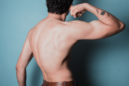 Rear view of a muscular young man flexing his arm