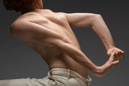 Rear view of muscular man with naked posing isolated over grey background, studio shot