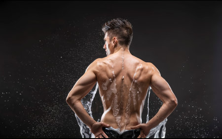 Beautiful nude men in drops of water stands back. Milk flows down the men body