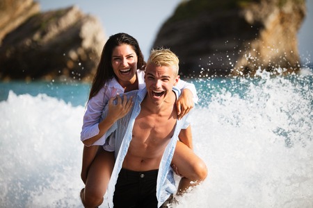 Happy cheerful couple having fun on a tropical beach at sunset
