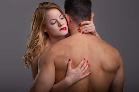 Passionate blonde 20s Caucasian woman embracing man while biting red lips, shirtless upper body