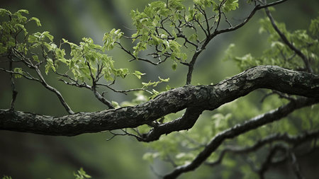 A rugged tree branch extending horizontally, adorned with vibrant green leaves, against a softly blurred green background, highlighting the beauty of nature.