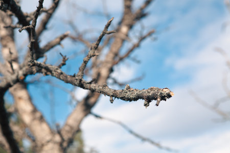 Tree with bare branches in nature on a sunny spring day and blue sky in the background. Close up and copy space for text or design