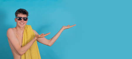low angle view of young shirtless man in sunglasses smiling against blue sky, banner