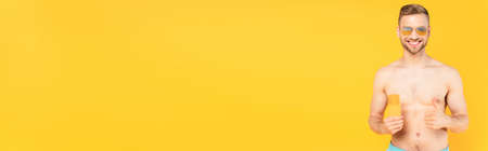 panoramic concept of happy shirtless man in sunglasses showing thumb up and holding bottle with sunblock isolated on yellow