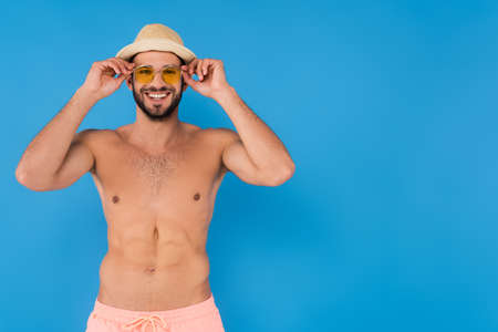 Cheerful shirtless man in sunglasses and straw hat on blue background