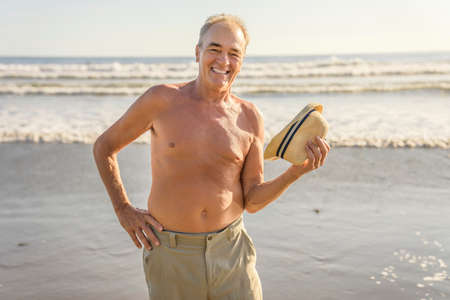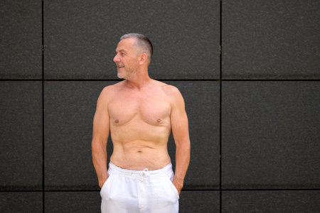 Shirtless senior man standing casually with hands in his pockets, looking to his left with a relaxed smile.