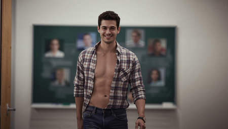 A young man stands in a classroom, grinning with confidence. He wears an open plaid shirt and jeans, with a blackboard and portraits hanging in the background.