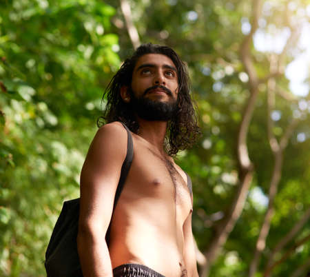 Handsome athletic young man in the wild forest. Outdoor activities and sports.
