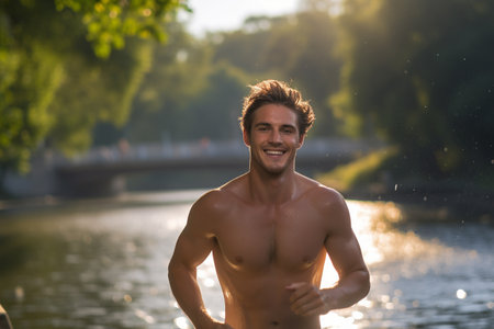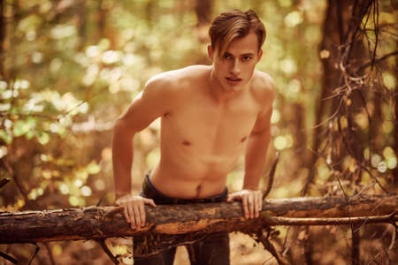 Handsome shirtless man with muscular body type is in the forest at daytime.