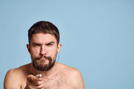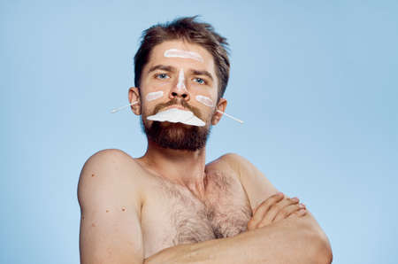 Young guy with a beard on a blue background, sponge, cotton pad, cream.