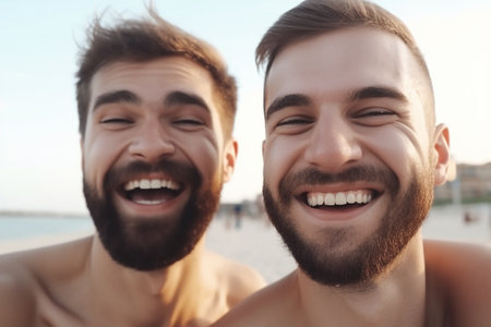 Two male friends on a beach, Generative AI