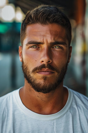 Portrait of a handsome man with beard wearing a white t-shirt.