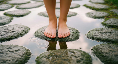 Bare feet standing on a cool, wet stone path with small puddles reflecting the sky. serene scene after rain, evoking freshness, nature, and tranquility.