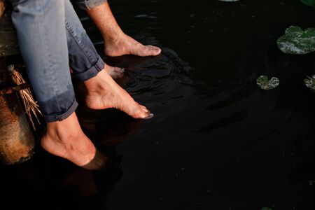 Unrecognizable young woman is dipping her foot in cool water of pond, refreshing and hardening concept.