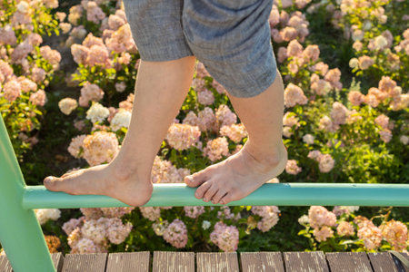 child walks barefoot on a railing in front of blooming hydrangea bushes on sunny day. Happy childhood, a fun walk in the park. Summer, joy, freedom. The benefits of walking barefoot for healthy feet