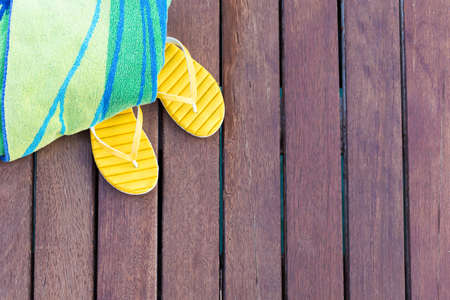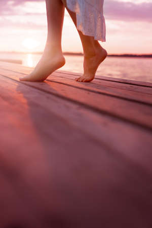 Feet of woman in flip-flops standing on wooden pontoon at sea resort. Summer vacation concept