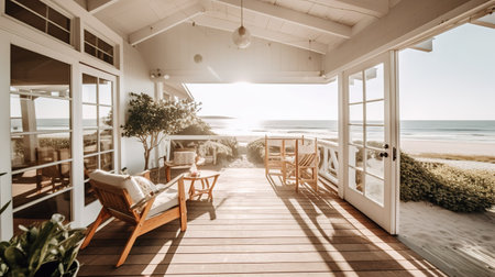 A patio with a table and chairs overlooking the ocean. Generative AI image.
