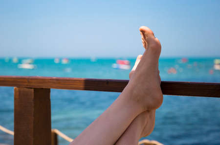 Legs of a girl on a wooden floor and a view of the blue sea.