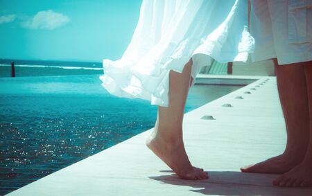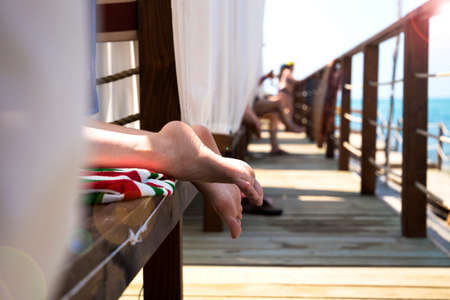 Beautiful woman legs sitting on chair on white terrace of villa hotel resort Sea View