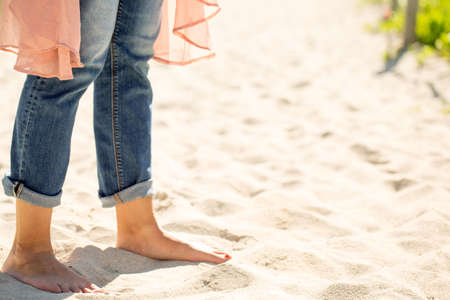 Woman's Jeans and Bare Feet on the Wooden Background Great For Any Use.