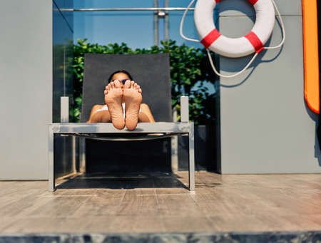Unrecognizable woman feet laying on a sun lounger with the swimming pool in the background in hot summer time