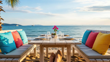 Elegant outdoor space with plush seating and a modern table, perfect for relaxing by the ocean at sunset. Enjoy nature's beauty in a peaceful atmosphere.