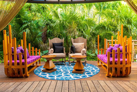 Luxury villa terrace with minimalist contemporary decoration ,neutral tones and minimal furniture. Premium residential Real Estate composition.
