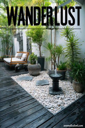 An inviting outdoor patio showcases a water fountain surrounded by pebbles and planters. The scene features lush green plants, and a wooden lounge chair. The composition is well-lit, suggesting a bright day. The image could be used for lifestyle, travel, and wellness-related commercial projects.