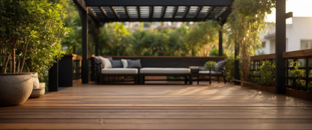 AI Generated. Luxurious morning outdoor garden teak wood deck and black pergola in elegant design