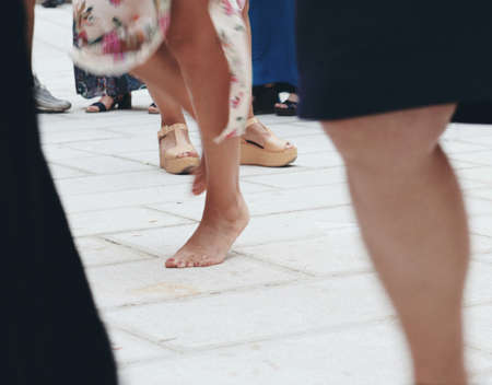 Young woman dancing barefoot on city street among crowd of people, celebrating life, enjoying happy moment, having fun outdoors, close up view. Wedding party dancer moving to music