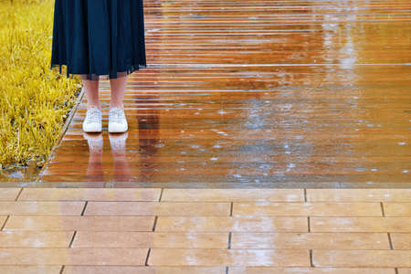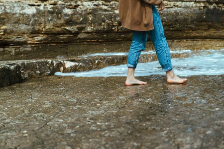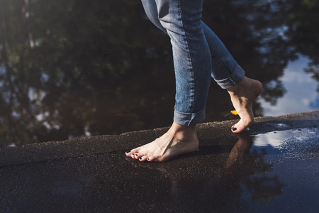 Barefoot woman in blue jeans walking on a water edge on a wet pavement