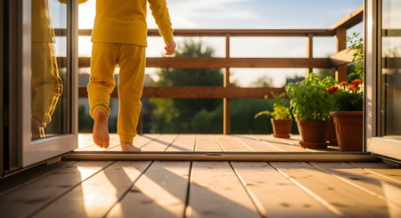 A young child dressed in yellow pajamas walks barefoot out of an open glass door onto a wooden deck. The golden morning sunlight floods the scene, highlighting the potted plants and the peaceful outdoor atmosphere of a new day.