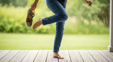 A person wearing blue jeans stands on one foot on a wooden porch, balancing while holding a brown leather sandal. The background shows a blurred green lawn, suggesting a relaxed summer day and casual outdoor lifestyle.