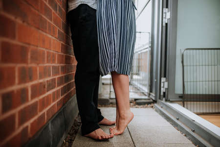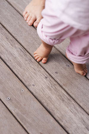 Little child walking on veranda with mother. Close-up of bare legs of woman and toddler standing on terrace in summer. Childcare concept