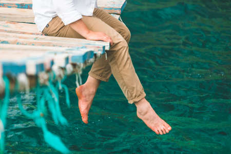 crop picture man sitting at suspension bridge put legs in sea water summer time