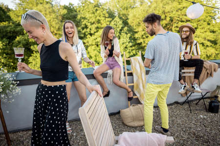 Young stylish friends having fun, hanging out and drinking wine at party on the rooftop terrace
