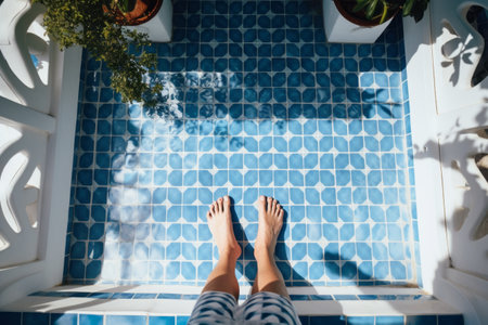 Footprints of Serenity: A Person in Sandals Standing on Blue and White Floor Tiles --ar 3:2