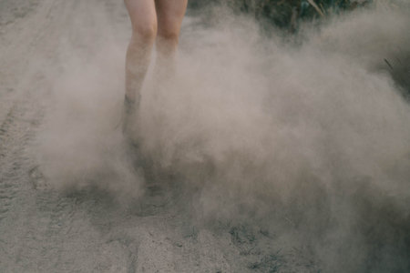 female legs jumping in the desert through fine dust carrying clouds of dust