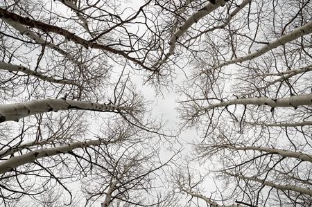 view up into bare aspen branches on a gray overcast day