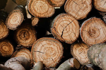 Natural wooden logs cut and stacked in pile, felled by the logging timber industry, Abstract photo of a pile of natural wooden logs background